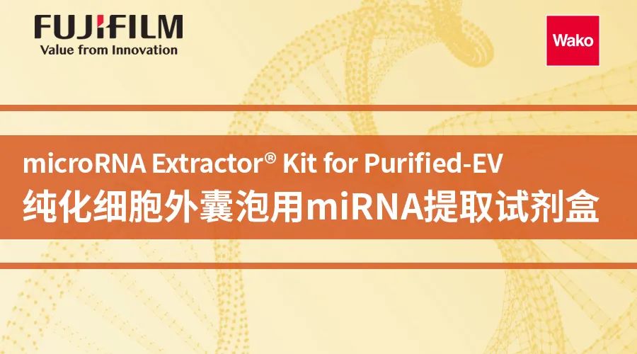 外泌体等细胞外囊泡(EV: Extracellular vesicle)中含有分泌细胞来源的microRNA(miRNA),其作用备受关注。通常情况下,EV中的miRNA会通过二代测序或微阵列进行全面分析,而从外泌体提取miRNA的工序是与分析结果直接相关的重要步骤。FUJIFILM Wako开发了更适合从纯化EV中提取RNA的试剂盒——纯化细胞外囊泡(EV)用miRNA提取试剂盒