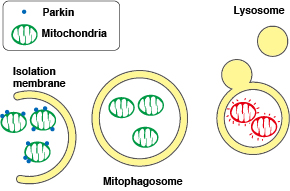 Parkin, an ubiquitin ligase known as the gene responsible for Parkinson’s disease, plays an important role in autophagic elimination of mitophagy. When mitochondria are depolarized and dysfunctional, PTEN-induced putative kinase protein 1 (PINK1) accumulates on the outer membrane, and recruits Parkin on the damaged mitochondria. The outer membrane on the mitochondria is then ubiquitinated through the ubiquitin ligase activity of Parkin. Finally, the poly- ubiquitinated mitochondria are selectively recognized and executed by autophagic process.