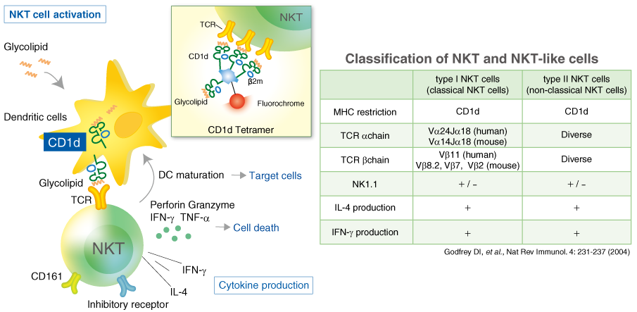 CD1d is a membrane protein non-covalently bonded to β2-microglobulin (β2m) and shows high homology between human and mice. CD1d can present α-galactosylceramide (α-GalCer), a glycolipid extracted and isolated from the marine sponge, and this complex can activate human and murine CD1drestricted NKT cells. CD1d Tetramer-PE is a reagent prepared by tetramerization of complexes of CD1d and β2m by PE- or APC- labeled streptavidin. Binding this reagent to α-GalCer enables highly sensitive detection of CD1d-restricted NKT cells and can be combined with antibodies to study NKT cell function by flow cytometry.
