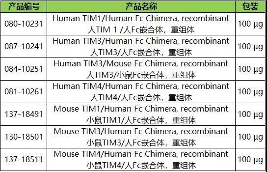 本系列是人或小鼠TIM家族(TIMD1、 TIMD3、TIMD4)的胞外域与人IgG1或小鼠IgG2a的Fc结构域N末端(包括铰链序列)融合的重组蛋白。