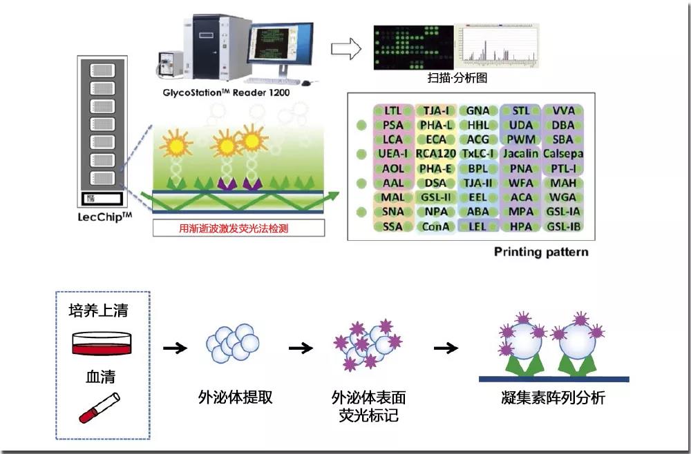 图1. 凝集素微阵列系统和外泌体糖链分析的流程