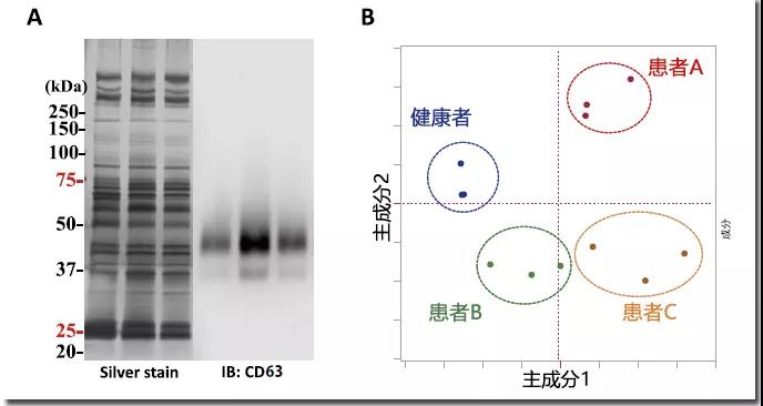 (A)各混合血清中提取外泌体的银染和抗CD63抗体蛋白印迹