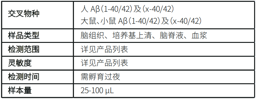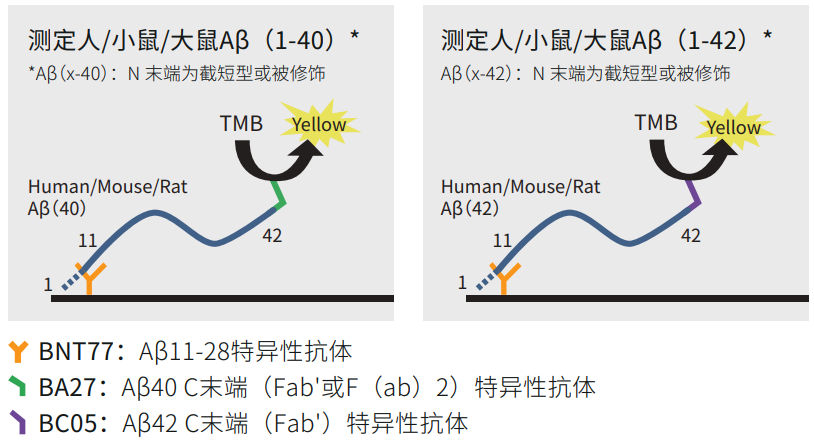 另可提供四种单独的抗体:BAN50(识别Aβ N末端)、BNT77(识别Aβ中部)、BA27(识别Aβ40 C末端)、BC05(识别Aβ42 C末端),用于WB或IHC。