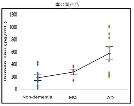 结果表明:与其他公司的产品相比,该试剂盒检测的非痴呆症患者(non-dementia)、轻度认知障碍患者(MCI)和阿尔茨海默病患者(AD)之间的差异更显著。