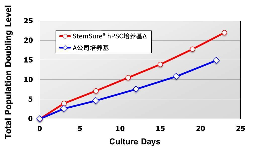 移植到StemSure® hPSC培养基Δ后,立即进行第1~5次传代。结果显示,与A公司培养基相比,细胞的增殖能力没有差异。