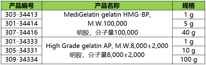 Nippi低内毒素明胶 品牌简介 Nippi致力于胶原研究,研究胶原蛋白已有半个多世纪,并成功开发了低内毒素浓度的胶原试剂和明胶试剂。Nippi可以提供胶原、明胶试剂产品及其相关支持,以满足其应用于从基础研究到临床研究的需求。 什么是内毒素? 内毒素是组成革兰氏阴性菌细胞壁的脂多糖(Lipopolysaccharide),简称为LPS,是具有代表性的热原(pyrogen),即使只有pg(10-12 g)或ng(10-9 g)进入血液,也会引起发热、炎症等各种生理反应。此外,内毒素具有极高的耐热性,需要在250℃以上干热灭菌30 min以上才能完全灭活,一旦混入,就难以去除。因此,直接给药体内的药物、医疗器械、以及再生医疗等产品需从原材料开始尽量减少内毒素的污染。 低内毒素明胶 明胶是使胶原蛋白特有的三链螺旋立体结构变性以恢复其天然构象的产物。当纤维状胶原变性时会变得相对可溶。FUJIFILM Wako可提供使用Nippi超净室生产的低内毒素医用猪皮来源High-grade明胶和Medigelatin系列产品。可广泛应用于注射剂用稳定剂、给药基质、再生医学等领域。 ◆特点 ● 猪皮来源 ● 冻干品 ● 生产过程中过滤灭菌(0.2 μm 过滤) ● 低内毒素 (10 EU/g以下) 各种明胶对巨噬细胞(小鼠来源)NO产生的影响 各种明胶产品的分子量分布 HMG-BP:Nippi 低内毒素明胶产品(MediGelatin HMG-BP) ◆产品相关 明胶HMG-BP ● 碱处理猪皮明胶 ● 可凝胶化(250 g以上的高胶冻强度) ● 等电点(pI):≈5 ● 生产过程包括病毒灭活步骤 ● 皮内反应测试阴性/抗原性测试阴性 ● 1 g、5 g包装:符合日本药典“纯化明胶”标准 ● 40 g包装:符合日本药典“生产专用”标准(已在日本原薬等登録原簿MF登记(228MF40025)) High-grade明胶系列 APAT ● 酸处理猪皮明胶 ● 中等分子量(约60 kDa)的非胶凝明胶 ● 符合日本药典“纯化明胶”标准 AP ● 酸处理猪皮明胶 ● 小分子量(约8 kDa)非胶凝明胶 ● 拥有作为注射用稳定剂的使用实例 ● 1 g、10 g包装:符合日本药典“纯化明胶”标准 ● 100 g包装:符合日本药典“生产专用”标准 ◆ 产品列表 ※ 仅供实验研究用,不可用于临床诊断。 Prev Next