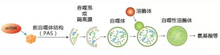 胞内物质被扩大的膜囊包裹,吞噬泡形成双层膜囊泡,成为自噬体。自噬体外膜随后与溶酶体融合,和内部物质被自噬性溶酶体降解。自噬的各种调节因子也被描绘于图中。