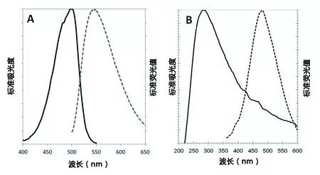 Hoechst33342(图B)在1X测定缓冲液来确定的吸光度和荧光图谱(350 /461 nm)。