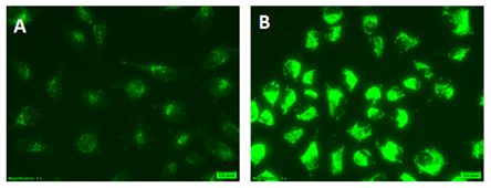 (A) 完全培养基 (B) 在饥饿培养基 (EBSS)中添加40 µM Chloroquine培养4 h 。在含有Chloroquine 的EBSS培养基中培养的细胞表现非常明亮的绿色荧光信号和点状结构。