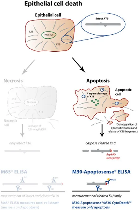 M30 Apoptosense® 是基于M30单抗的ELISA试剂盒(Leers et al., 1999)。该抗体可以特异性结合caspase-cleaved角蛋白18(ccK18、caspase-celaved cytokeratin 18、ccCK18或者K18-Asp396)。caspase水解角蛋白18形成3个片段,其中1个片段氨基酸第387位-第396位含有新表位(neoeptitope),这个片段就称为caspase-cleaved角蛋白),但是不结合天然、未切除的K18。M30 Apoptosense® 因此可特异性检测上皮细胞的凋亡情况(Hägg et al. 2002)