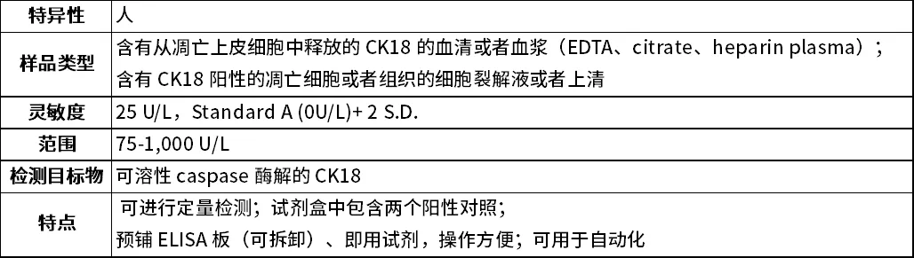 ●特异性定量检测表达角蛋白18细胞的细胞凋亡,包括肝细胞,乳腺癌、肺癌、前列腺癌、结肠癌等上皮细胞来源的肿瘤细胞。