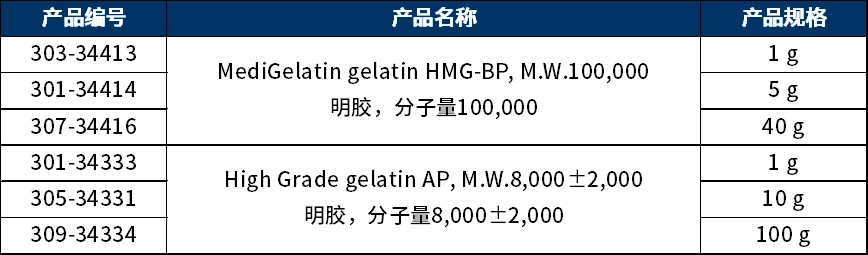 明胶是使胶原蛋白特有的三链螺旋立体结构变性以恢复其天然构象的产物。当纤维状胶原变性时会变得相对可溶。FUJIFILM Wako可提供使用Nippi超净室生产的低内毒素医用猪皮来源High-grade明胶和Medigelatin系列产品。可广泛应用于注射剂用稳定剂、给药基质、再生医学等领域。