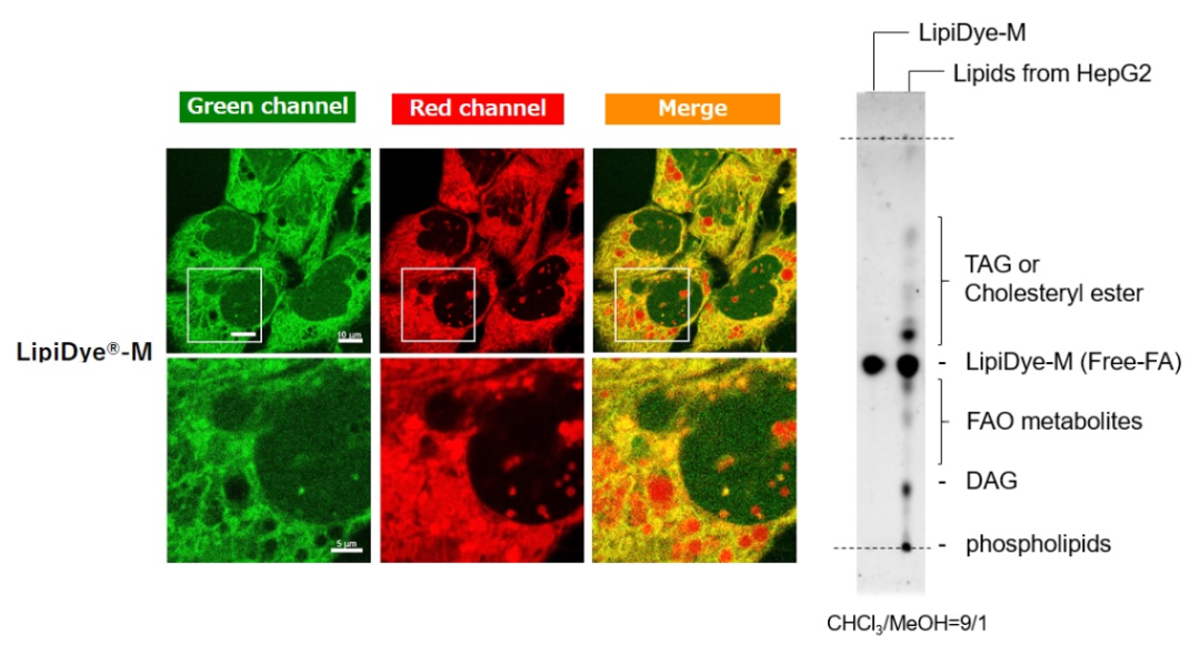 在含有油酸和棕榈酸的10% FBS条件下培养HepG2细胞,以促进脂滴产生。使用HBSS替换培养基,在饥饿状态下使用LipiDye®-M(5μM)处理60分钟后,于未洗涤条件下使用共聚焦激光扫描显微镜观察(Green channel Ex 473 nm / Em 490~540 nm,Red channel Ex 559 nm / Em 570~620 nm)。细胞饥饿状态下可观察到LipiDye®-M分布于HepG2细胞的细胞质(绿色),内质网(黄色),脂滴(红色)及线粒体(黄色)中。为确认LipiDye®-M的代谢状态,抽取HepG2细胞中的脂质成分并使用TLC分离后,以LipiDye®-M的荧光为指标进行检测。观察到TLC板上的多点表明,LipiDye®-M在HepG2细胞中被转化为各种脂质,TAG或胆固醇酯分布在游离脂肪酸型LipiDye®-M的上方(高疏水性),细胞器中的β脂肪酸氧化(FAO)代谢产物和DAG分布在下方(低疏水性),磷脂则被认为分布在原点附近。