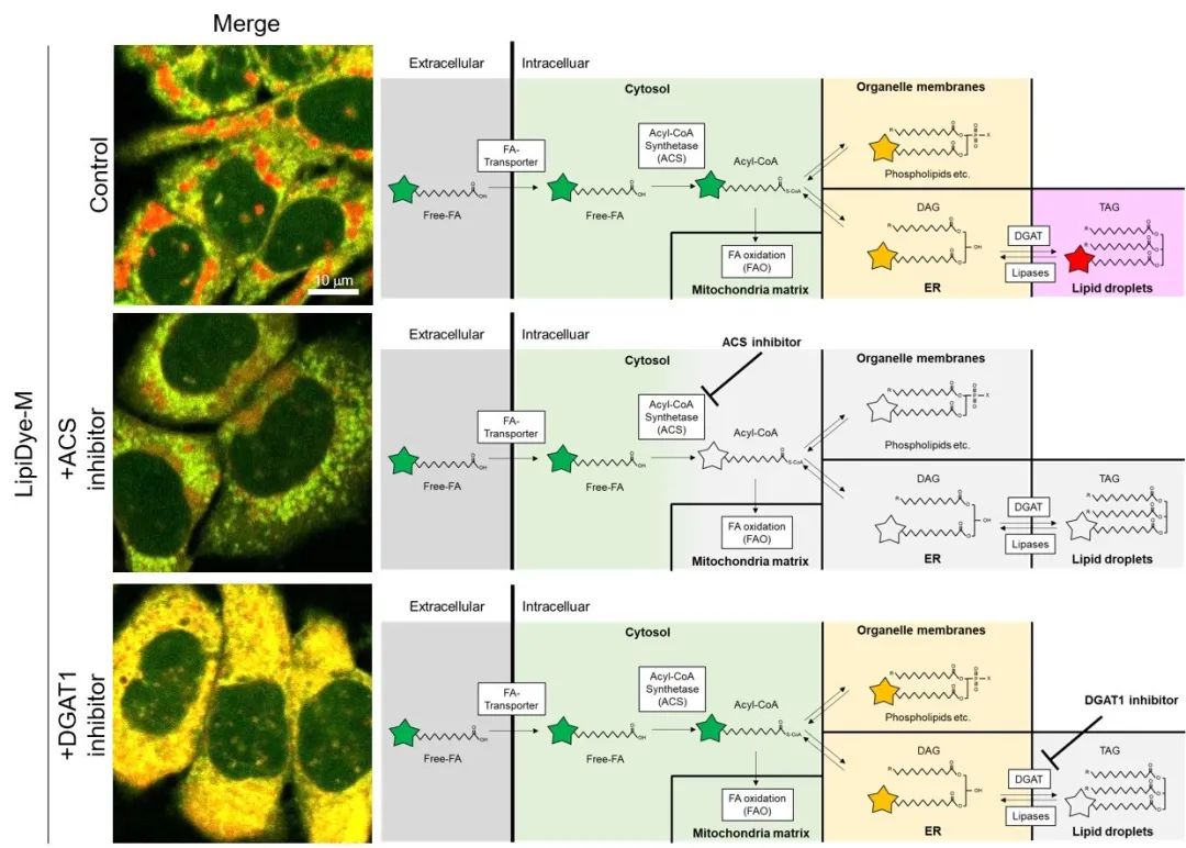 在含有CoA合成酶(ACS)抑制剂(Triacsin C)或TAG合成酶DGAT1抑制剂 (T863)的完全培养基中,对HepG2 细胞进行18小时的预处理,以抑制细胞内代谢途径(右图)。之后,为了促进脂滴的产生,在饥饿条件下用含有油酸 (0.5 mM)、抑制剂和 LipiDye®-M(5 μM)的HBSS培养基处理细胞6小时。在未洗涤的条件下使用共聚焦激光扫描显微镜(Green channel Ex 473 nm / Em 490~540 nm,Red channel Ex 559nm / Em 570~620 nm)进行观察。与对照组中脂滴的强红色荧光相比,经ACS抑制剂处理后的细胞中脂滴的红色荧光和细胞器膜的黄色荧光变弱,观察到绿色荧光较强。而另一组经DGAT1抑制剂处理后的细胞中,脂滴的红色荧光几乎无法用肉眼识别,细胞器膜的黄色荧光显著增强。经过ACS抑制剂处理过后的细胞由于无法将含LipiDye®-M的游离脂肪酸转化成酰基CoA,因此仍然以游离脂肪酸的形态存在于细胞中。另外也确认到了DAG由于DGAT1抑制剂的影响无法转化成TAG,使其无法转移至脂滴并积聚在内质网及其他细胞器膜上。如上述实例所示,在使用药物对细胞进行处理时,可通过对LipiDye®-M进行局部荧光分析,了解药物参与脂质代谢的哪一过程。