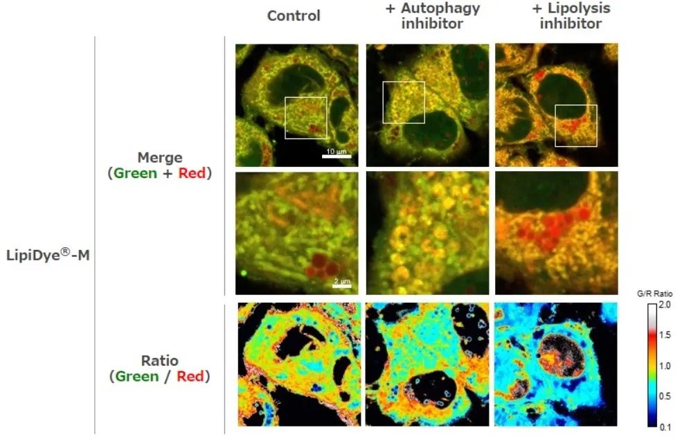 在含有自噬抑制剂(50 nM Bafilomycin A1;自噬体-溶酶体膜融合抑制剂)或脂肪分解抑制剂(100 μM DEUP)的HBSS培养基和LipiDye®-M(5 μM)的HBSS中培养HepG2细胞6小时后,使用共聚焦激光扫描显微镜(Green channel Ex 473 nm / Em 490~540 nm,Red channel Ex 559nm / Em 570~620 nm)进行观察,得到重叠后的荧光图像和比率分析图。在重叠后的对照组荧光图像中,囊泡样结构(自噬体)的膜呈黄色,因此可推断由自噬引起的脂质分解受到了抑制。另外,在使用脂肪分解抑制剂培养HepG2细胞的组中,观察到重叠荧光图像中整体的红色荧光增强,由此可见LipiDye®-M多积累于脂滴中和细胞器膜上。