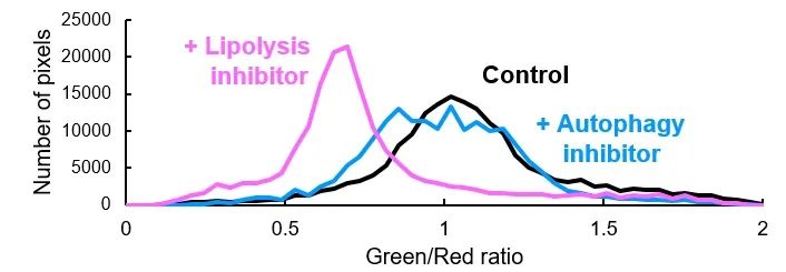 通过比率分析图和分布图可得知,相比于对照组和自噬抑制剂处理后的细胞,使用脂肪分解抑制剂处理的细胞其荧光Green/Red的比率大幅减少。