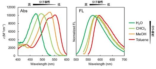 LipiDye®-M(论文原名:AP-C12)是一种能够克服上述问题的新型荧光标记脂肪酸。由名古屋大学transformative生物分子研究所 山口茂弘教授和多喜正泰特任副教授研究开发,使用C12脂肪酸为载体,连接新型荧光色素Azapyrene,含荧光基团在内总长相当于C18脂肪酸(图1左)。Azapyrene不同于常规使用的荧光染料,能够识别周围分子的极性使吸收波长与荧光波长同时发生变化。Azapyrene具有在强极性环境(亲水性)中转变为绿色,在弱极性环境(疏水性)中转变为红色的特性。因此通过选择适宜的激发光源和检测波段,可以区分和观察各种环境中的脂质代谢状态。