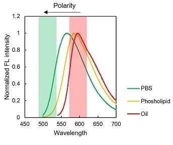 ● 荧光在强极性环境(细胞质)下呈绿色、中极性环境(细胞膜)下呈黄色、弱极性环境(脂滴)下呈红色。