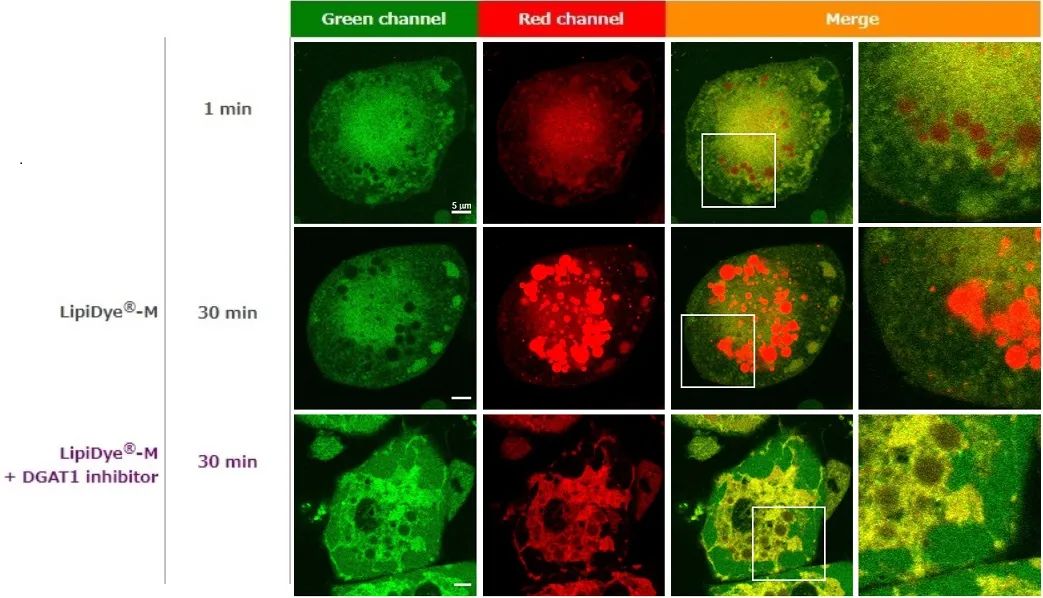 向脂肪细胞(由3T3-L1细胞分化)中添加LipiDye®-M(5μM),添加后无需清洗,分别在1分钟后和30分钟后,使用共聚焦激光扫描显微镜观察荧光(Green channel Ex 473 nm / Em 490~540 nm,Red channel Ex 559 nm / Em 570~620 nm)。添加1分钟后,从细胞质中观察到较强的绿色荧光信号。同时观察到脂滴的红色荧光信号较弱,因此可推测LipiDye®-M主要以游离脂肪酸或脂肪酸CoA状态存在于细胞中,尚未被脂滴充分摄入。添加30分钟后,绿色荧光信号减弱,脂滴的红色荧光信号增强,LipiDye®-M转变为TAG,由此可推测脂滴已充分摄入LipiDye®-M。使用TAG合成酶(DGAT)抑制剂进行处理,30分钟后,能观察到脂滴的红色荧光信号明显被抑制,内质网(ER)等细胞器膜呈现的黄色荧光信号增强。这一结果表明,LipiDye®-M在转化为DAG后并未继续转化为TAG,而是滞留于内质网等细胞器膜上。