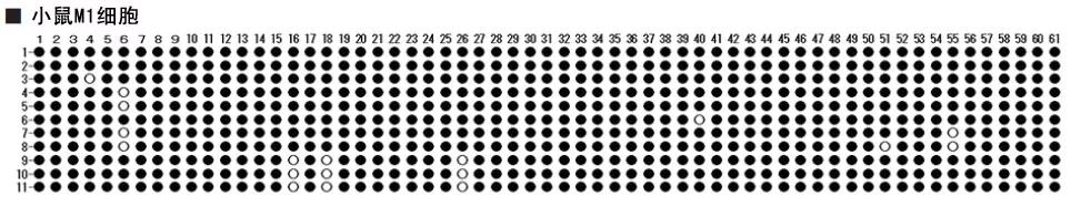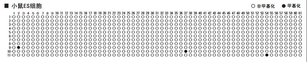 ES细胞和M1细胞的PCR扩增产物在克隆后,得到分析11个样本的碱基序列。小鼠ES细胞的Fgf4启动子区为非甲基化状态。小鼠M1细胞的Fgf4启动子区为甲基化状态。