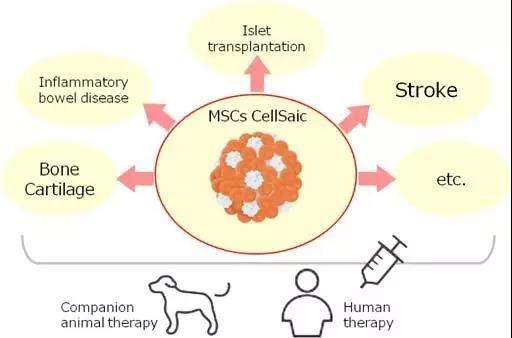 在MSC CellSaic相关的疾病治疗研究中,有MSC CellSaic应用于IBD (炎症性肠病)、脑梗塞、关节的骨软骨再生、胰岛移植的报告。这些应用的研究中,与单独使用MSC进行比较,使用MSC CellSaic 可以提高各种症状的改善效果。