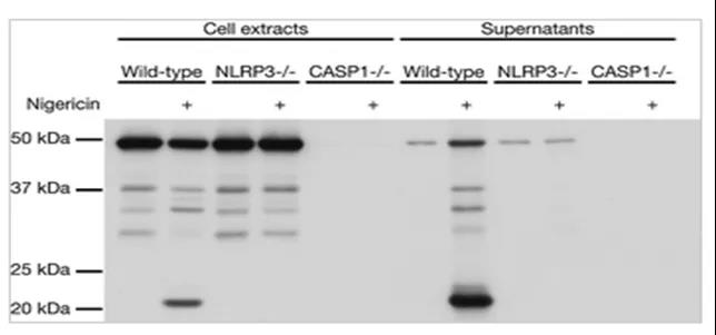 方法:对细胞提取物和从野生型小鼠分化骨髓来源树突状细胞(BMDCs)进行分化培养,用 5 μM (Nigericin)处理 30分钟,使用WB方法检测细胞上清中NLRP3-/-和caspase-1-/- 小鼠是否活化并表达蛋白。在还原条件下,用SDS-PAGE分离细胞提取物和上清液,转移到硝酸纤维素膜后,用anti-Caspase-1(p20)(mouse),mAb(Casper-1)(1 μg /mL)孵育,最后化学发光进行检测。