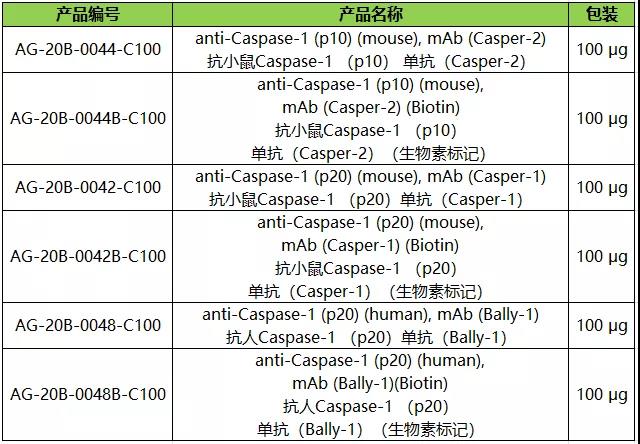 Caspase-1 是描述炎症的最佳caspase。它能提炼细胞因子interleukin-1β(IL-1β)和IL-18,并诱导 pyroptotic 细胞死亡。Caspase-1 由多蛋白复合物激活,由于在不同的炎症中都能检测到,所以被称为针对多种刺激的炎症小体。NLRC4对胞质鞭毛蛋白反应,鼠源NLRP1b对炭疽致死毒素反应,AIM2 对细胞质DNA反应,NLRP3则对包括晶体在内各种激动剂反应。