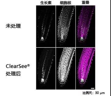 另外,用ClearSee® 透明化的样本亦可用荧光色素进行染色。细胞核染色时,向ClearSee® 中添加终浓度为10 μg/ mL的双苯甲酰亚胺H33258三盐酸盐,双苯甲亚胺H33342或DAPI,细胞壁染色时,使用终浓度为1 mg/mL,静置1小时后,更换新的ClearSee® ,再静置1小时后,在荧光显微镜下进行观察。