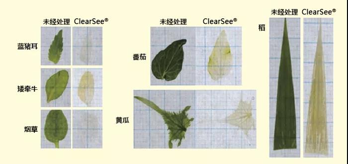 使用ClearSee® 透明化6天后的蓝猪耳、矮牵牛、烟草、番茄、黄瓜、稻叶。