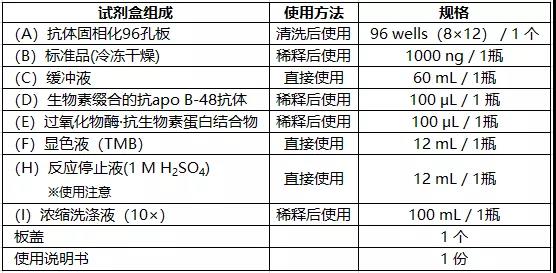 血浆脂蛋白(plasma lipoprotein)是由一定比例的脂质和蛋白质组成的复合体,负责血清脂质的转运。其表面构造含有载脂蛋白,并且发挥重要作用,例如稳定脂蛋白结构,激活与脂蛋白代谢有关的酶,与细胞表面上的脂蛋白受体结合等。载脂蛋白B48(ApoB-48)的分子量为264000, 结构上含有载脂蛋白B100的48 %的氨基酸序列,存在于VLDL,LDL,HDL的载脂蛋白B100,它在由肝脏来源的血浆脂蛋白中可以运输内源性脂质,。脂蛋白乳糜微粒(Chylomicron、CM)将来自食物等的外源性脂质转运到肝脏和外周组织,ApoB-48是在小肠中制造的,是CM特异的结构蛋白。因此,通过测定ApoB-48,来观察进食后的脂蛋白变化是最合适的。此外,通过测量同一样品中的LDL-,HDL-胆固醇和B48,可以分析外源胆固醇和内源性胆固醇的变化(参考文献2)。对于在心脏血管中引起粥样硬化症的原因之一的CM残留的评估也有帮助作用。