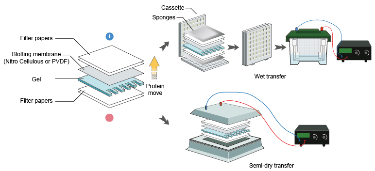 免疫印迹(WB)是在SDS-PAGE的基础上,将胶上的蛋白转移至NC膜或者PVDF膜上,利用抗体-抗原特异性相互作用,逐步通过连续性的信号对称,用化学发光或者化学显色的方式将抗原呈现出来,WB是目前三大印迹法中应用最为广泛的一种。